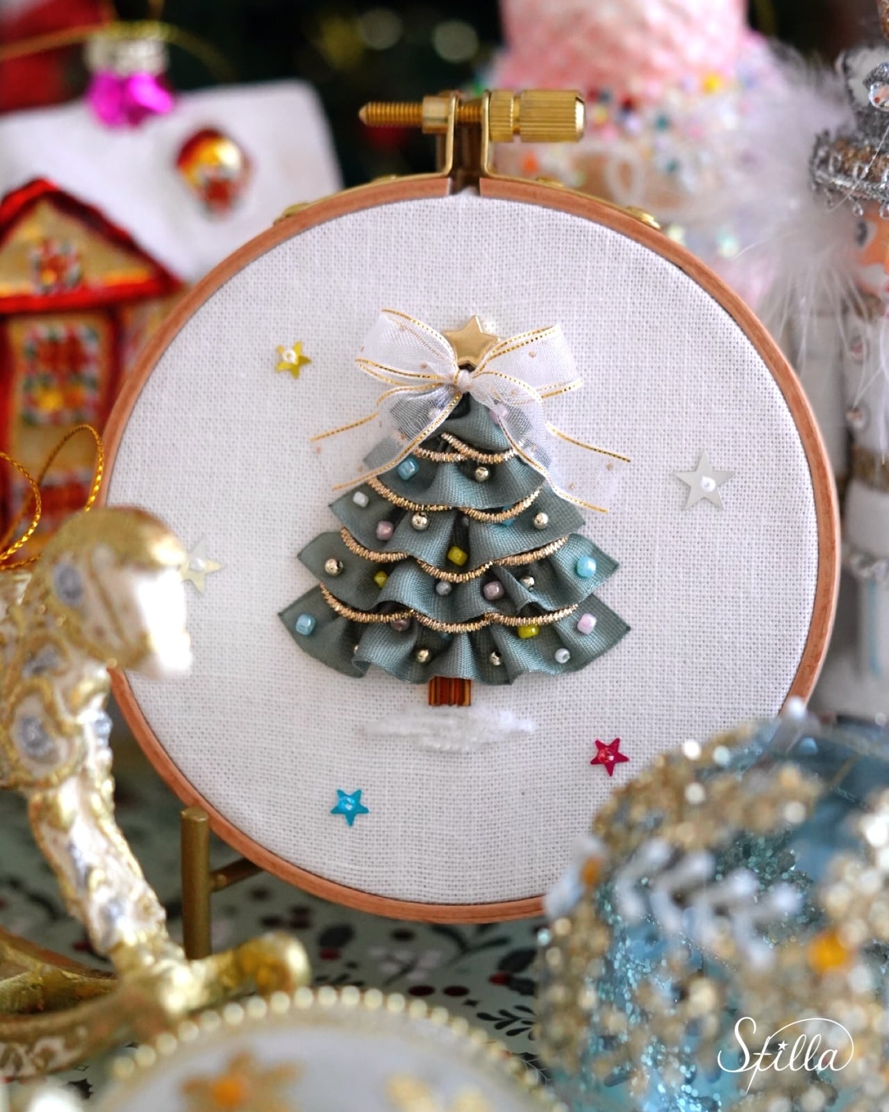 ツリーとリースの飾り部分にビーズを刺繍し、リボンやチャームを組み合わせてオリジナルのデザインに仕上げます。